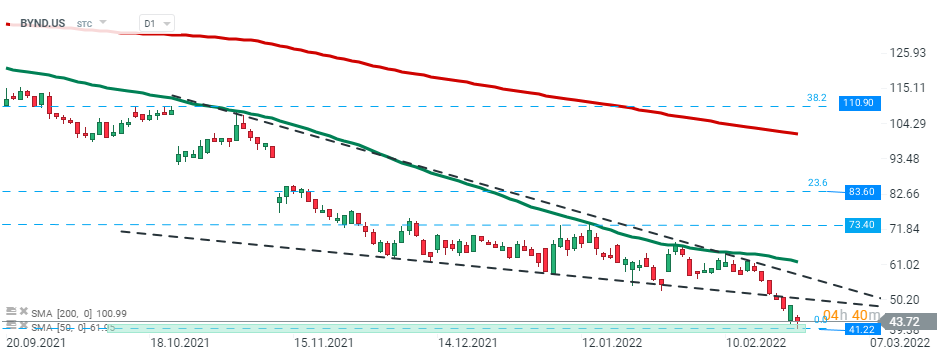Las acciones de Beyond Meat (BYND.US) cayeron bruscamente al nuevo mínimo histórico de 41,22 dólares, aunque los compradores lograron borrar la mayor parte de las pérdidas de hoy. Fuente: xStation5