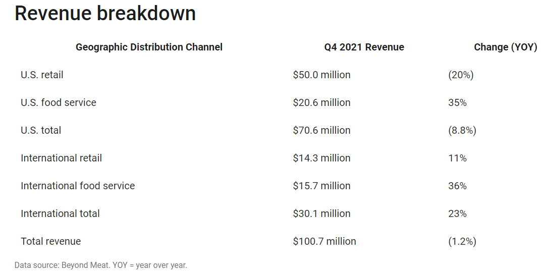 Las ventas minoristas en EE. UU. fueron la única categoría que registró una disminución en los ingresos. Sin embargo, esta categoría es la más grande de las cuatro, por lo que tiene el mayor impacto en el desempeño general de la empresa. Fuente: Más allá de la carne a través de Motley Fool