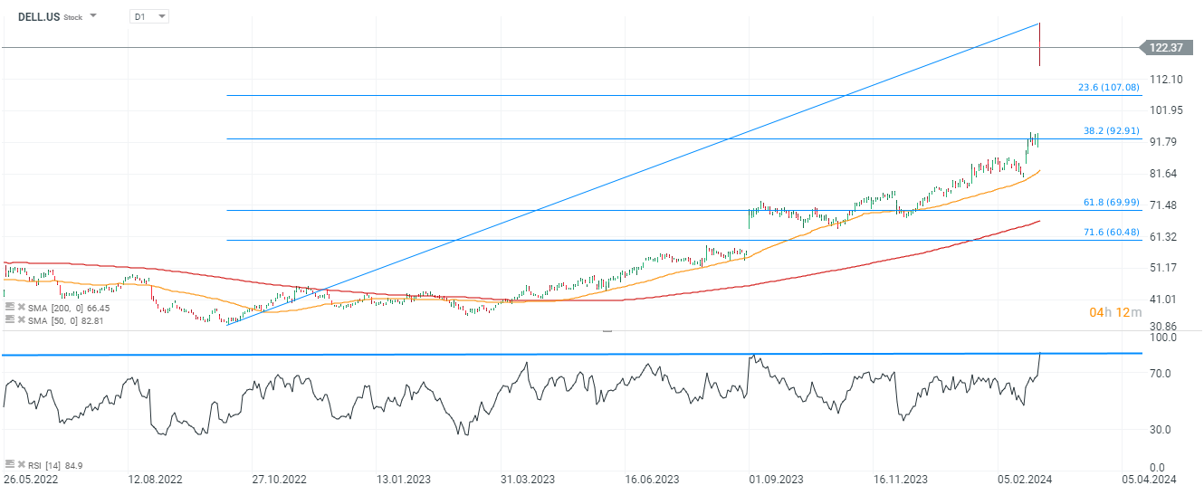 Después de informar resultados mejores de lo esperado para el cuarto trimestre, las acciones de Dell Technologies (DELL.US) subieron más del 28% hoy, reavivando el sentimiento de los inversores en torno a la inteligencia artificial. La compañía atribuyó su éxito a la fuerte demanda de servidores de IA y espera una mejora gradual en el desempeño comercial en el segmento de almacenamiento masivo y PC. Dell pronostica un crecimiento anual promedio de los ingresos del 3% al 4%, con al menos un aumento del 8% en las ganancias ajustadas por acción, superando las expectativas del mercado de un crecimiento plano.