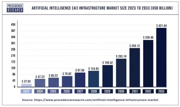 Crecimiento del mercado del mercado de infraestructura de IA. Fuente: Precedence Research