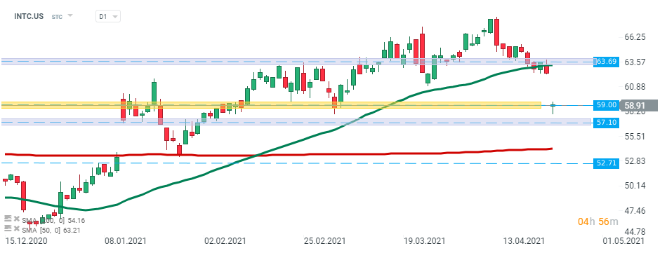 Las acciones de Intel (INTC.US) lanzaron la sesión de hoy con una brecha de precios bajista después de que el fabricante de chips informara una guía decepcionante para el trimestre actual. Fuente: xStation5