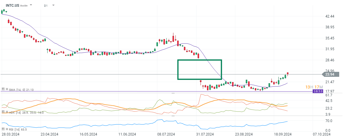 Las acciones de Intel han sufrido una fuerte corrección en este 2024, a pesar del rebote del 15% de los últimos días, pero dejaron un hueco en el mes de julio muy relevante. Pensamos que se podría cerrar este hueco, ya que el precio ha superado ligeramente su media móvil de los últimos 14 días. Además, su RSI ha rebotado al alza después de estar muy cerca de la zona de sobreventa, lo que unido a un ADX que índica fuerte tendencia podríamos ver el precio subir hasta los 30$ en el medio plazo. El primer movimiento no parece que será fuerte, pero se podría conseguir poco a poco. Por la parte baja, tiene un soporte en la zona de 18,5$, aunque de momento parece que se ubicará lejos de estos niveles.
