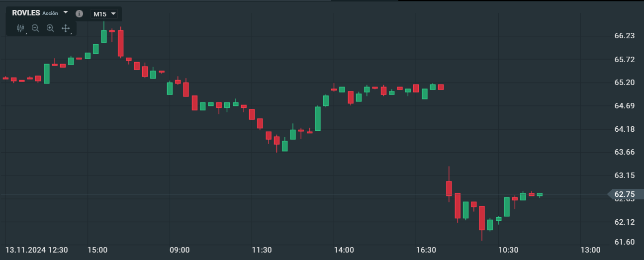 - Cotización de las acciones de Rovi (Velas de 15 minutos).