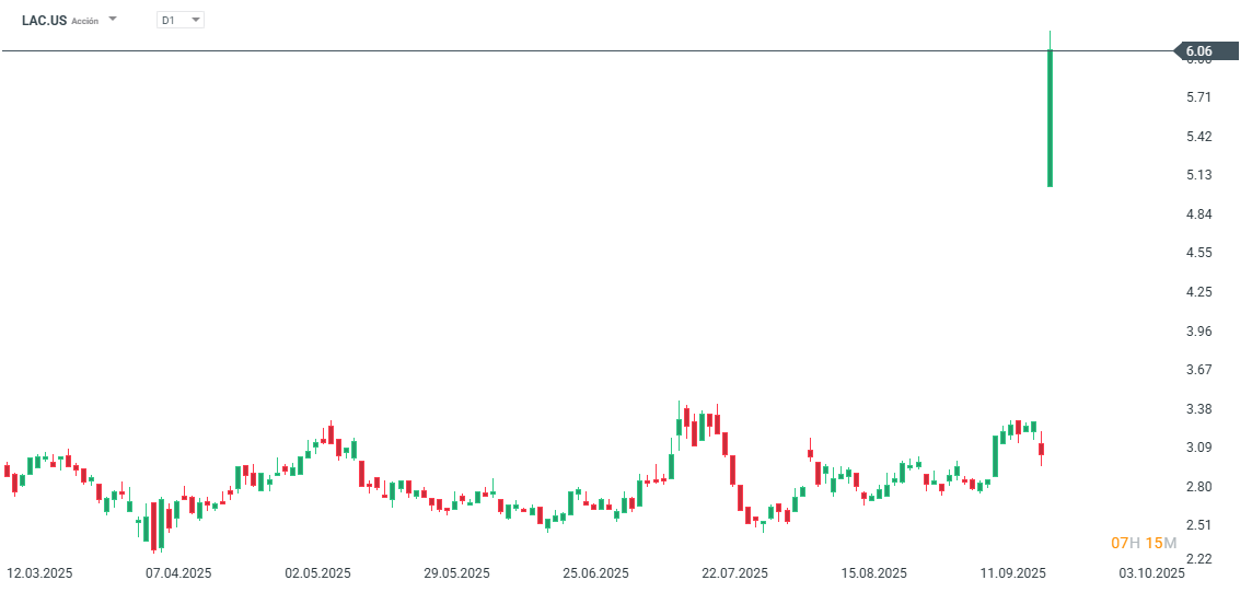 Las acciones de Lithium Americas (LAC.US), minera con sede en Vancouver con operaciones en Estados Unidos, se dispararon cerca de un 80% hoy miércoles, impulsadas por la noticia de que la administración Trump evalúa adquirir una participación directa en la compañía. La propuesta surge en paralelo a las negociaciones para reestructurar un préstamo de 2.200 millones de dólares concedido por el Departamento de Energía, destinado a financiar el megaproyecto de litio Thacker Pass, ubicado en Nevada.