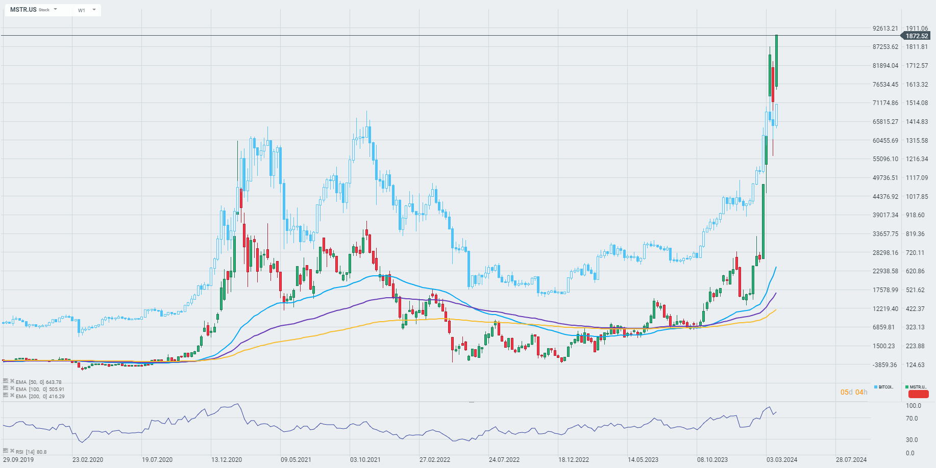 En la ola de enormes alzas observadas en las criptomonedas durante la sesión de hoy, se observa un aumento de casi el 23% en las acciones de MicroStrategy (MSTR.US). En total, esta empresa posee un total de 214.246 BTC, lo que representa alrededor del 1% del suministro total de esta criptomoneda. La última compra de 9245 BTC se realizó el 19 de marzo.