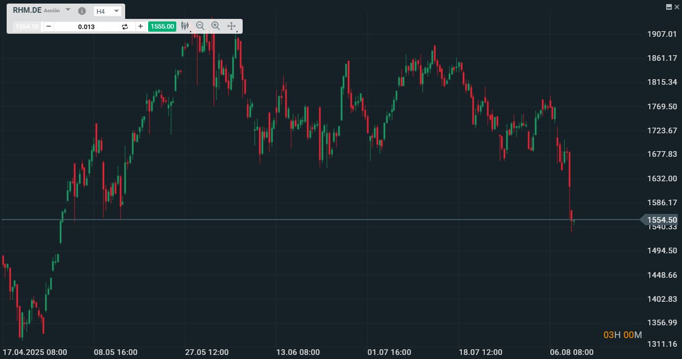 Las acciones de Rheinmetall AG están sufriendo una fuerte corrección en la sesión de hoy, cayendo más de un 4% y situándose en torno a los 1.560 euros por acción, su nivel más bajo en lo que va de mes. La caída continúa tras la publicación de sus resultados, que si bien muestran crecimiento en ingresos y beneficios, han dejado al descubierto debilidades que preocupan al mercado, profundizando el retroceso iniciado tras la presentación de sus resultados semestrales