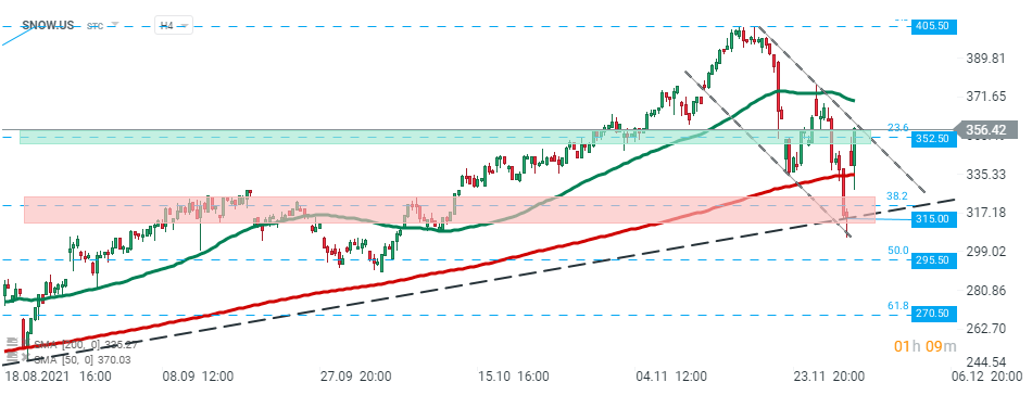 Las acciones de Snowflake (SNOW.US) cayeron bruscamente recientemente, sin embargo, los compradores lograron detener las caídas alrededor de la zona de soporte en $ 315, que coincide con el 38.2% de retroceso de Fibonacci de la última ola alcista y la línea de tendencia alcista. La acción lanzó la sesión de hoy al alza y actualmente está probando el límite superior del canal descendente local, que se ve reforzado por un 23,6% de retroceso de Fibonacci. En caso de que ocurra una ruptura al alza, el movimiento alcista puede acelerarse hacia un máximo histórico en $ 405.50. Fuente: xStation5