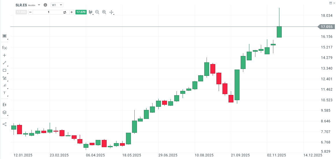 Las acciones de Solaria suben un 100% en lo que va de año duplicando su valor hasta los 17 euros por título. La mejora de Goldman Sachs, de neutral a compra, le adjudica un precio objetivo de 22 euros, lo que le deja un 30% de potencial alcista.