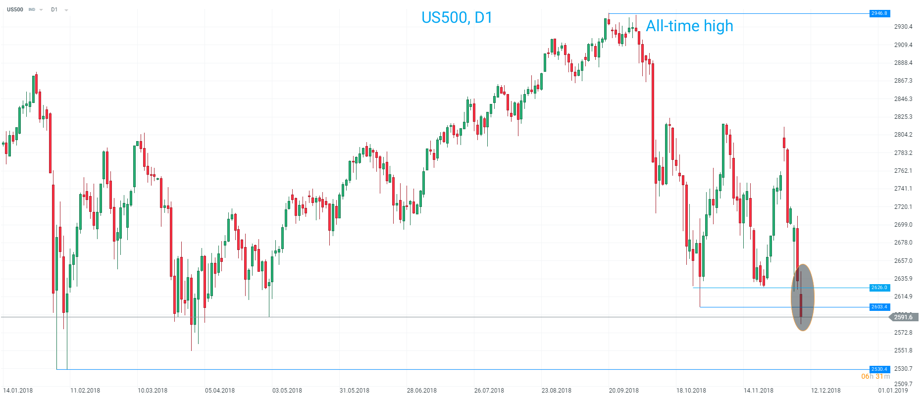 El US500 ha roto por debajo del mínimo de 2603 puntos visto en octubre y el mercado ahora ha abierto la posibilidad de una nueva prueba del mínimo de 2530 puntos del comienzo del año. Fuente: xStation