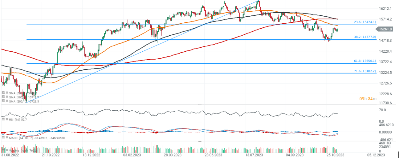 Si observamos el gráfico de futuros del DAX en el intervalo D1, vemos que el índice continúa su movimiento bajista y el límite clave en el escenario alcista parece ser el nivel de 14.400 puntos, donde vemos el retroceso de Fibonacci de 23,6 onda ascendente del otoño pasado y una resistencia clave a corto plazo del promedio móvil SMA50 (línea naranja). Potencialmente, una ruptura por encima de este nivel podría significar una sacudida de la estructura bajista y un repunte hacia los 15.700 puntos donde vemos la SMA200 (línea roja) y una formación bajista del llamado 'cruce de la muerte' en el que la SMA100 promedia. Perfora el SMA200 desde arriba, lo que en cierto sentido es lo opuesto a la formación de la 'cruz dorada' de febrero de 2023. Fuente: xStation5