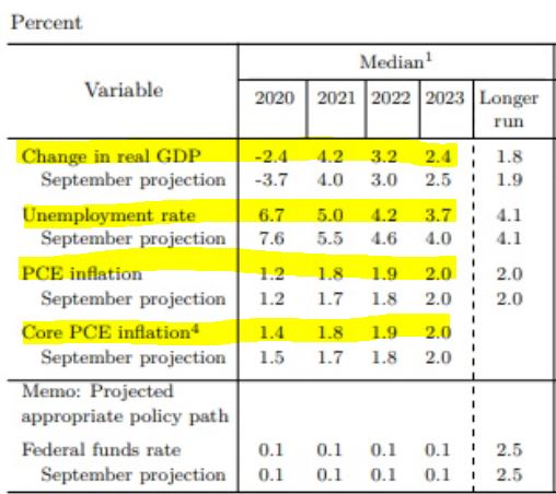Las proyecciones económicas se vieron impulsadas ligeramente. El FOMC prevé una menor contracción del PIB en 2020 y un crecimiento más rápido en 2021-2022. Se espera que la tasa de desempleo sea más baja que en el pronóstico de septiembre. Fuente: Reserva Federal