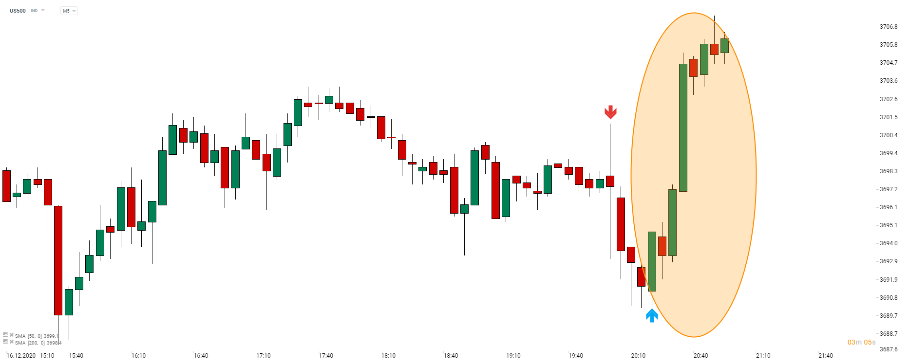 US500 cayó después de la publicación de la declaración de decisión del FOMC (flecha roja). Sin embargo, el índice comenzó a recuperarse cuando comenzó la prensa de Powell (flecha azul) y se las arregló para negociar a nuevos máximos de sesión. Fuente: xStation5