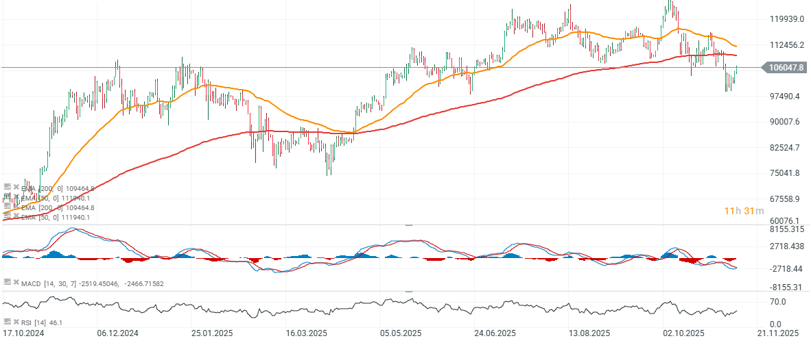 Las criptomonedas intentan recuperarse tras fuertes caídas. El BTC cayó cerca de un 20% desde su máximo histórico, mientras que Ethereum retrocedió hasta los 3.000 dólares, desde los 4.900 dólares alcanzados durante el verano. Hoy, ambas criptomonedas principales suben junto con los índices bursátiles estadounidenses, donde la mejora del sentimiento podría indicar mayores entradas de capital en los fondos cotizados (ETF). Las esperanzas de una reapertura del gobierno estadounidense han aumentado, mientras los republicanos continúan negociando los detalles con los demócratas. Es importante destacar que la reapertura del gobierno también impulsaría la liquidez del mercado, lo que, más allá de la mejora del sentimiento económico, podría ser un factor estructural clave para esta tendencia.
