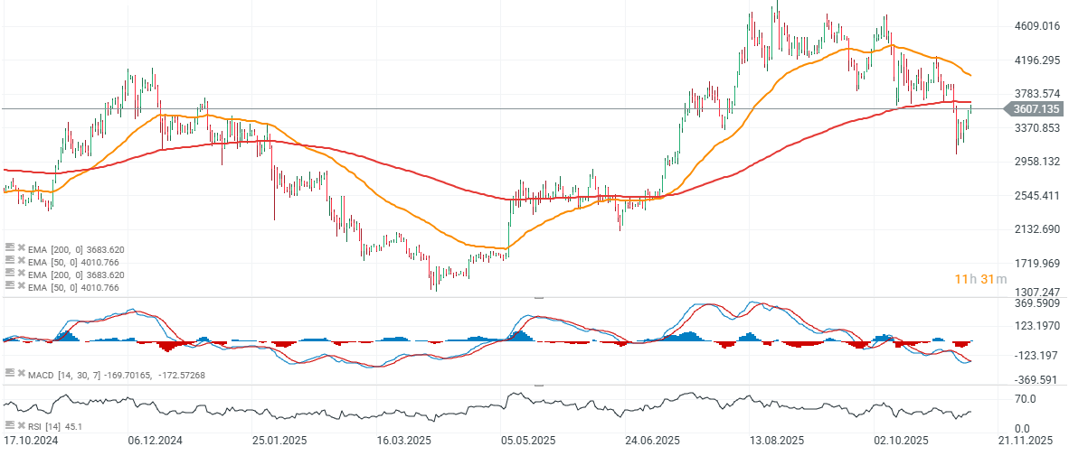 Al observar los gráficos de las dos criptomonedas más importantes, vemos que ambas intentan recuperar la EMA de 200 días (línea roja), con Ethereum mostrando un repunte más fuerte. El token cotiza en torno a la media móvil clave cerca de los 3600 dólares. El indicador RSI para ambas criptomonedas asciende gradualmente hacia 50, lo que sugiere una disminución significativa de la presión vendedora.