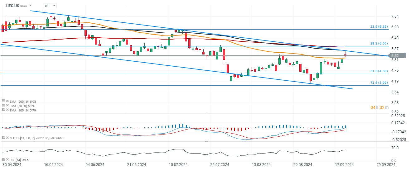 Las acciones de Uranium Energy Corp. suben más del 4%, Centrus Energy, que se especializa en la producción de combustible nuclear para el mercado estadounidense, repunta un 5%, y la segunda minera de uranio más grande del mundo después de Kazatomprom y Cameco sube más del 8%. Como podemos ver a continuación, las acciones de UEC han superado la media móvil simple (SMA50) y se han acercado al límite superior del canal de tendencia bajista. Una ruptura por encima de los 6 $ (retroceso de Fibonacci del 38,2, escapando del canal de precios) podría anunciar un cambio de tendencia.