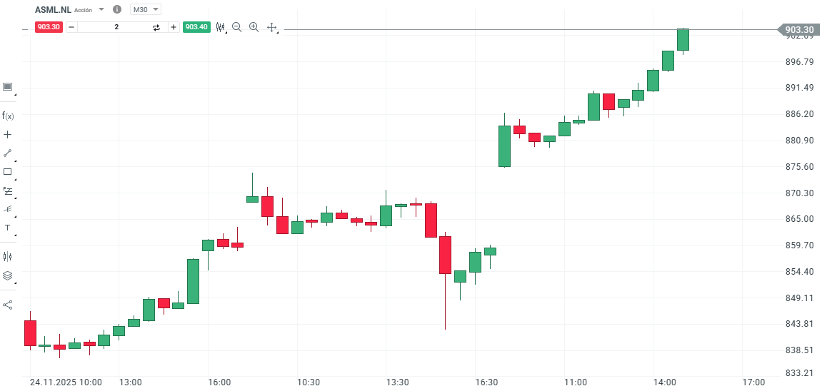 Las acciones de ASML suben un 5,1% mientras que en el conjunto del año la tecnológica holandesa repunta un 31%.