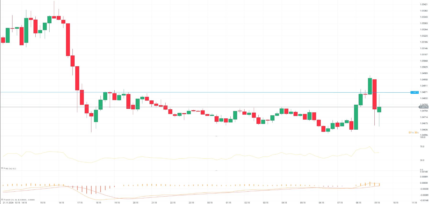 El EUR/USD mostró una reacción limitada a los datos PMI más débiles, manteniéndose por debajo del nivel de resistencia a corto plazo de 1,04872. La respuesta moderada sugiere que las cifras decepcionantes fueron en gran medida descontadas o eclipsadas por otros factores del mercado. Fuente: xStation5