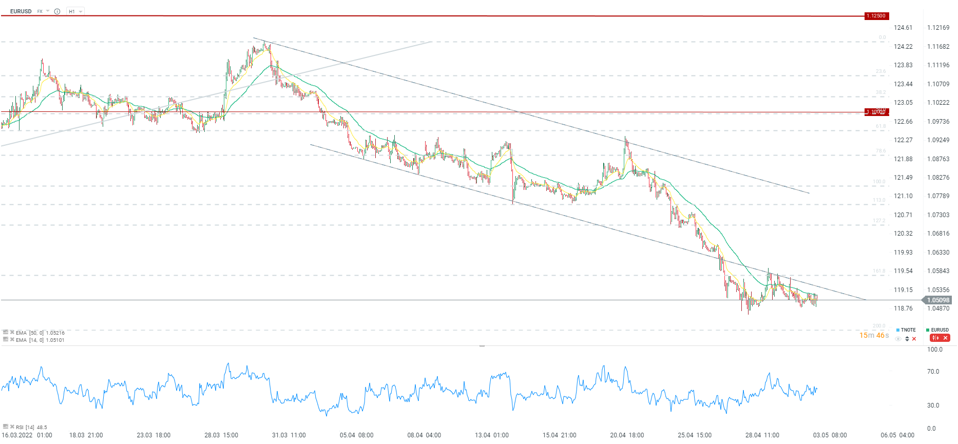 La volatilidad en EURUSD es insignificante hoy. EURUSD está ligeramente por encima del nivel de 1.0500. Al mismo tiempo, el par se encuentra por debajo del límite inferior del canal de tendencia bajista. Cerca del nivel de 1.0600 hay una resistencia fortalecida por el retroceso de Fibo 161.8 de la última gran ola alcista de la segunda quincena de marzo. La decisión de la Fed de mañana puede aumentar ligeramente la volatilidad en el par de divisas principal. Fuente: xStation5