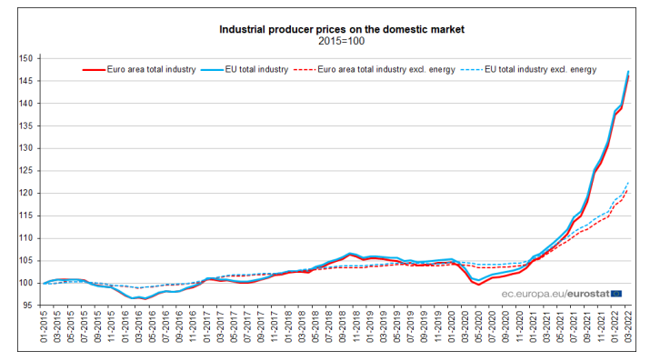 Incluso sin los costos de la energía, la inflación de los productores está aumentando a un ritmo enorme en la Eurozona. Fuente: Eurostat
