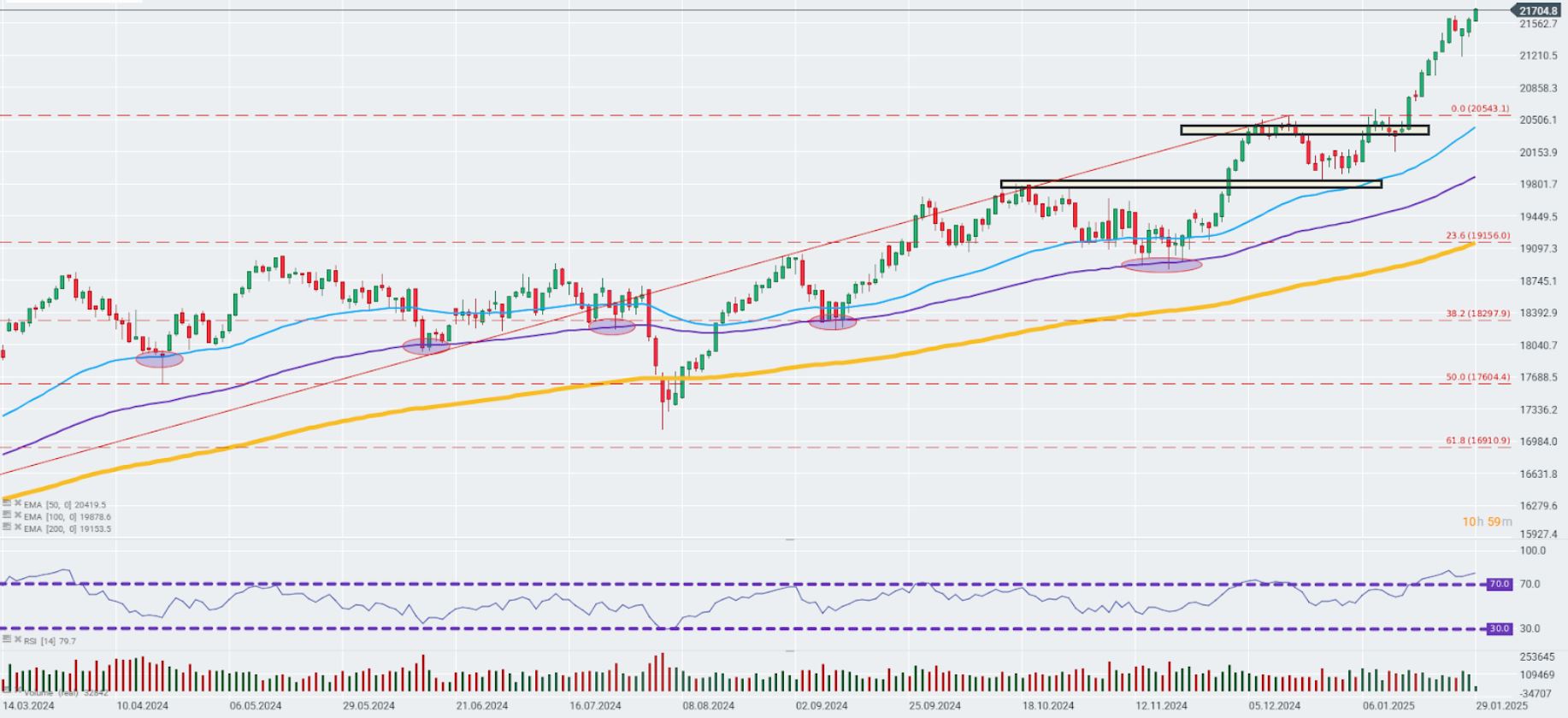 El Dax 40 continúa hoy su impulso alcista anterior y alcanza nuevos máximos históricos. El soporte más importante para el índice sigue siendo invariablemente la EMA de 50 días (curva azul en el gráfico) y el pico reciente que rompió el índice en la zona de los 20.500 puntos. Técnicamente, el Dax 40 sigue manteniendo una tendencia alcista estable todo el tiempo. Fuente: xStation