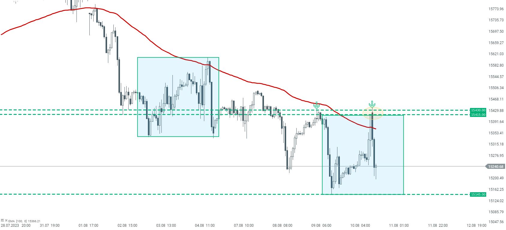Desde una perspectiva técnica del Nasdaq, este logró superar hoy la media móvil exponencial (EMA100). Sin embargo, las subidas no duraron mucho y los vendedores aparecieron en la zona de resistencia de 15415-15430 puntos, que se derivó de máximos locales anteriores y del límite superior del sistema 1:1.