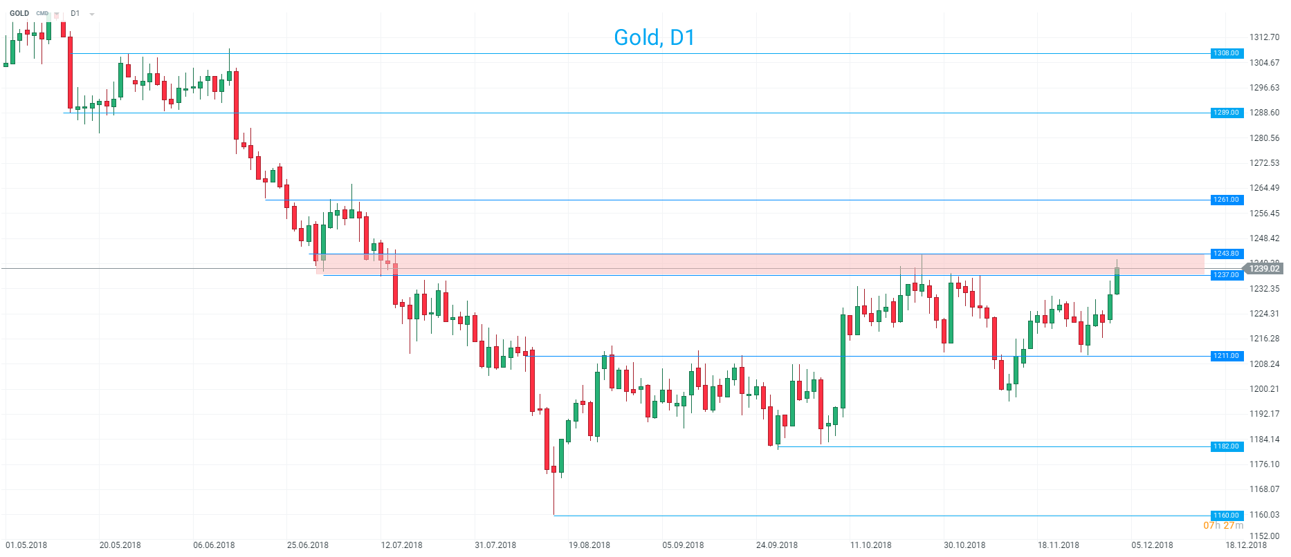 El oro ha subido a su nivel más alto en más del último mes con el mercado rotando hacia la zona de resistencia anterior de 1237-1244. La forma en que reaccione el precio en estos niveles podría ser clave en el futuro. Fuente: xStation5