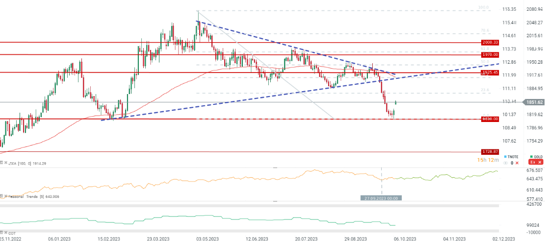 Desde un punto de vista técnico, el oro continúa rebotando desde el área de 1.810 $ que comenzó el viernes. El precio inició la nueva semana con una gran brecha de precios alcista y los operadores deben estar atentos a los posibles intentos de llenar esta brecha durante el día. Sin embargo, si los alcistas mantienen el control, los siguientes niveles de resistencia a tener en cuenta se pueden encontrar en 1.875 $ (retroceso del 23,6%) y 1.885 dólares (mínimos locales de agosto). Fuente: xStation5
