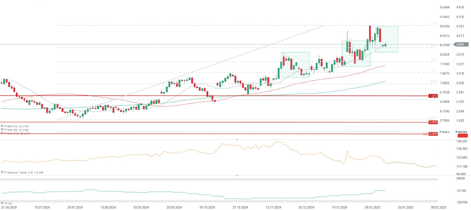El precio del Gas Natural está probando el soporte en el retroceso de 23,6 y en el promedio de 15 períodos. Sin embargo, es probable que los precios del Gas Natural caiga por debajo de estos niveles después de renovar los contratos a plazo. Actualmente, la renovación será la última importante y ascenderá a -44 centavos. Fuente: xStation5