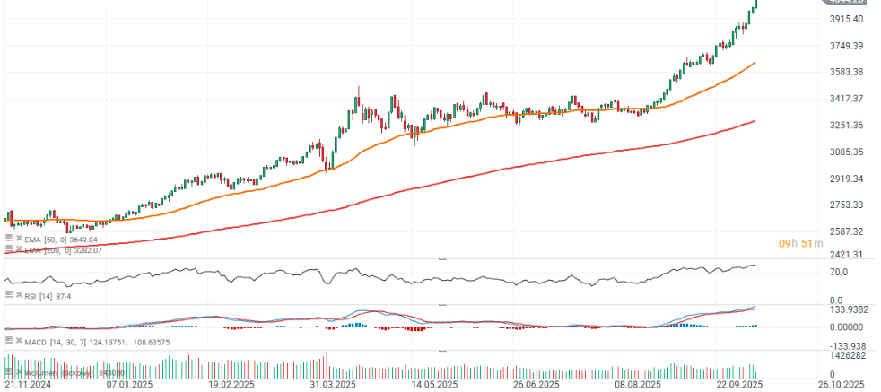 El oro ha superado los 4.000$ por onza y continúa su repunte hacia el nivel de 4.050$. El indicador RSI en el marco temporal diario se acerca a 90, lo que muestra condiciones de sobrecompra, mientras que la brecha entre el precio y el promedio móvil exponencial de 50 días (EMA50, línea naranja) se está ampliando. El promedio actualmente se sitúa alrededor de 3.650$, aproximadamente un 10% por debajo de los máximos locales de hoy. En cuanto al volumen de operaciones, la actividad de compra ha dominado las últimas cuatro sesiones. El mercado de predicciones Kalshi estima que el cierre del gobierno de EE. UU. durará alrededor de 22 días, lo que implica que las oficinas federales podrían no reabrir hasta alrededor del 22 de octubre. Esto supone que la Reserva Federal no recibirá datos macroeconómicos clave, incluidos los informes de inflación del IPC y del NFP de septiembre.