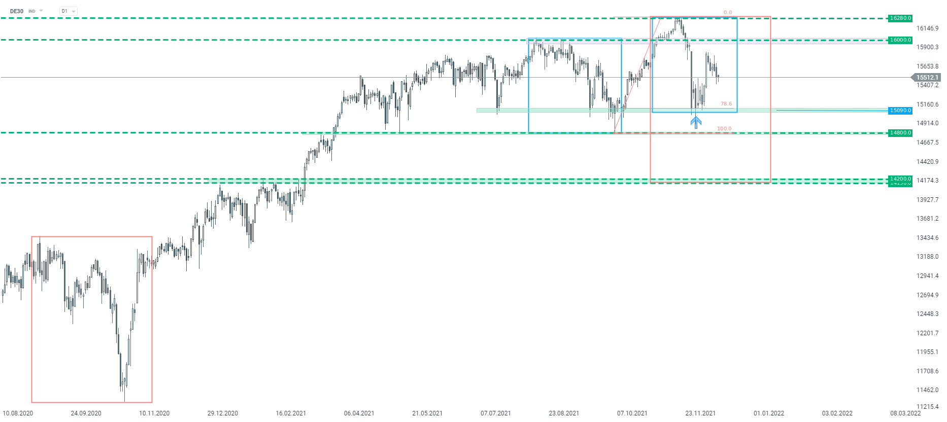 Por último, pero no menos importante, echemos un vistazo al índice alemán: DAX (DE30). Al observar el intervalo D1, se puede ver que la reciente corrección a la baja se detuvo en el soporte clave alrededor de 15.090 pts. Este nivel está marcado con reacciones de precios previas, límite inferior de la estructura local 1: 1 (rectángulos azules) y 78,6% de retroceso de Fibonacci. En teoría, mientras el precio se mantenga por encima, los compradores tienen la oportunidad de reanudar la tendencia principal. Sin embargo, los alcistas necesitan empujar el precio por encima del nivel redondo de 16,000 puntos para iniciar un movimiento alcista más grande. Por otro lado, romper por debajo del área de 15,090 ps podría allanar el camino hacia una corrección brusca. Considerando el escenario bajista, el próximo soporte potencial se encuentra en 14.200 pts, que coincide con el límite inferior de la estructura más grande 1: 1 (rectángulo rojo). También se debe prestar atención a un soporte horizontal en 14,800 pts.