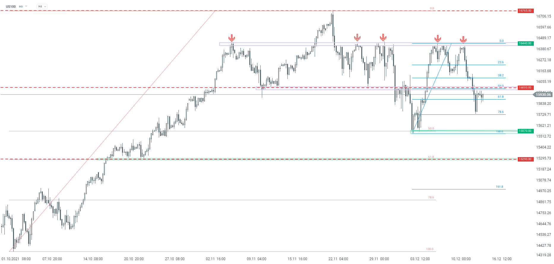 Comencemos el análisis de hoy con el índice tecnológico de EEUU: Nasdaq-100 (US100). Al observar el intervalo H4, se puede ver que el índice no logró romper por encima de la zona de resistencia clave en 16,440 pts y se produjo un movimiento descendente más grande. El precio cayó por debajo del soporte cerca de la ronda de 16.000 pts, por lo que la corrección a la baja puede acelerarse. Según el clásico del análisis técnico, siempre que el precio se sitúe por debajo, el ataque al nivel de los 15.570 pts es el escenario base. Si se produce la ruptura por debajo de este nivel, la corrección a la baja puede profundizarse hacia el soporte alrededor del área de 15,290 pts. Por otro lado, un retorno por encima del mencionado nivel de 16.000 pts puede presagiar una reanudación de la tendencia alcista.