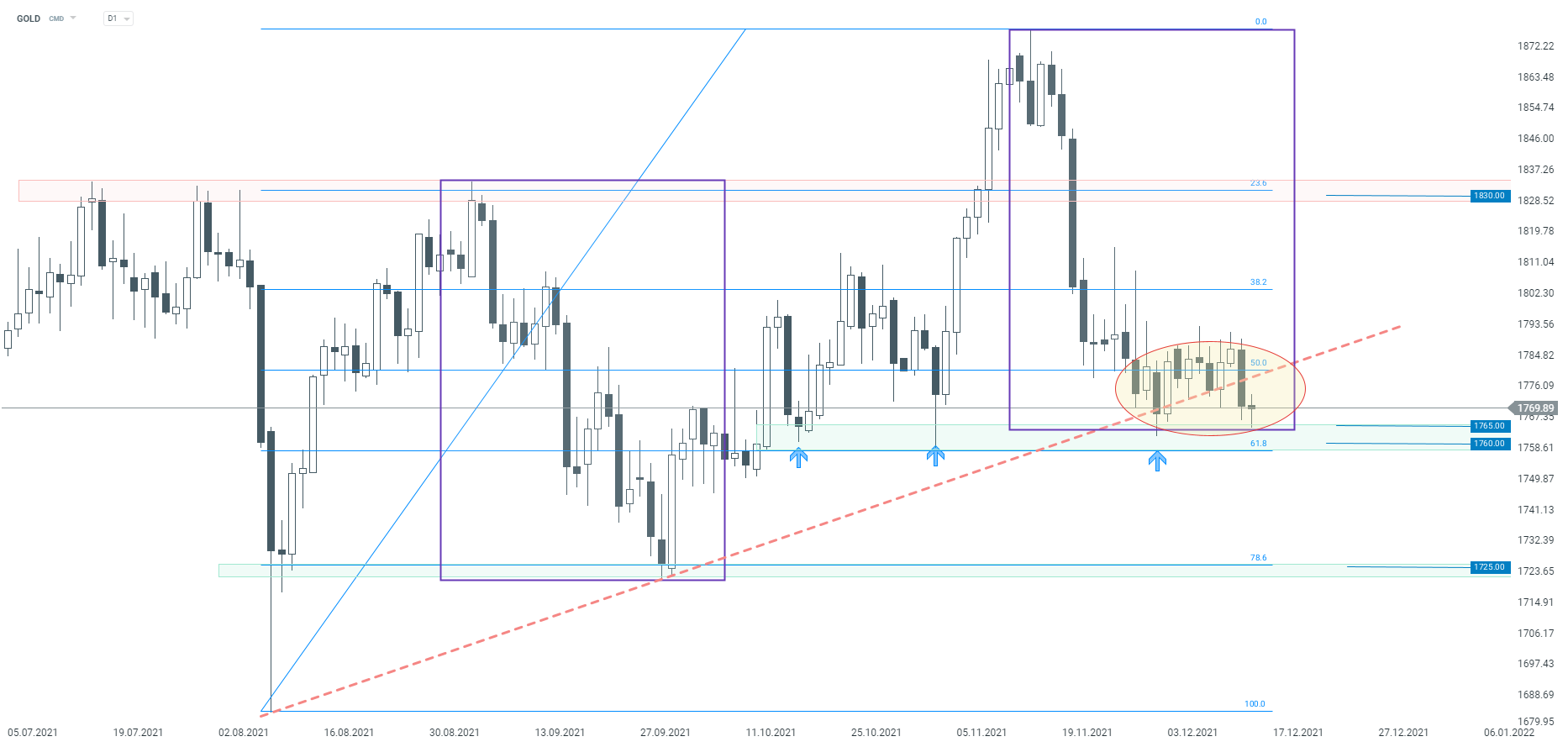 A continuación, pasemos al mercado del oro. En cuanto al intervalo D1, el precio de este producto se ha movido lateralmente recientemente. Sin embargo, mirando el gráfico desde una perspectiva más amplia, se puede ver que el reciente movimiento a la baja se detuvo en el área de soporte clave alrededor de 1.760 - 1765 $, que es crucial desde la perspectiva a mediano plazo. De acuerdo con la metodología Overbalance, rebotar en este soporte puede presagiar la reanudación del movimiento alcista. Por otro lado, si los compradores no muestran determinación, es posible que continúe el movimiento a la baja. Si el precio se rompe por debajo del área de soporte antes mencionada, la venta masiva puede acelerarse hacia el próximo soporte en $ 1,725.