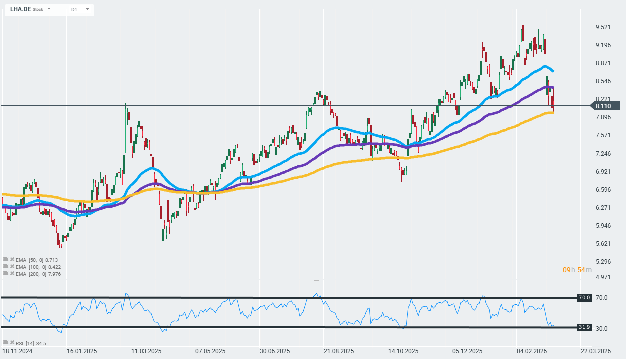 Las acciones de Lufthansa están actualmente poniendo a prueba el límite inferior de la tendencia alcista marcada por la media móvil exponencial de 200 días (curva dorada en el gráfico).