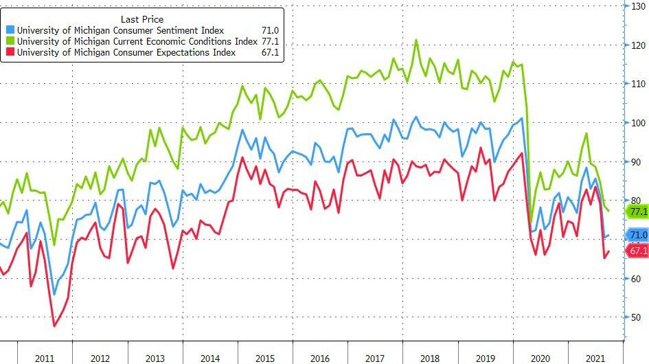 El sentimiento del consumidor de la Universidad de Michigan hacia los EEUU aumentó ligeramente a 71 para septiembre de 2021 desde un mínimo de una década de 70,3 en agosto, mostraron estimaciones preliminares. La publicación del viernes fue ligeramente más débil que la expectativa del mercado de 72.0. Más detalles de la publicación revelaron que el índice de condiciones actuales cayó a 77,1. desde 78,5 y el índice de expectativas del consumidor saltó a 67,1 desde 65,1. La perspectiva de inflación a un año de la encuesta volvió a subir al 4,7% este mes para coincidir con la lectura de julio, que había sido la más alta desde 2008, desde el 4,6% de agosto. La perspectiva a cinco años se mantuvo sin cambios en 2.9%.