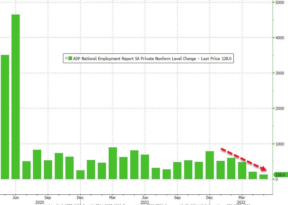 Las nóminas privadas aumentaron solo 128k el mes pasado, la ganancia más baja de la recuperación de la era de la pandemia, según ADP. Fuente: Bloomberg vía ZeroHedge