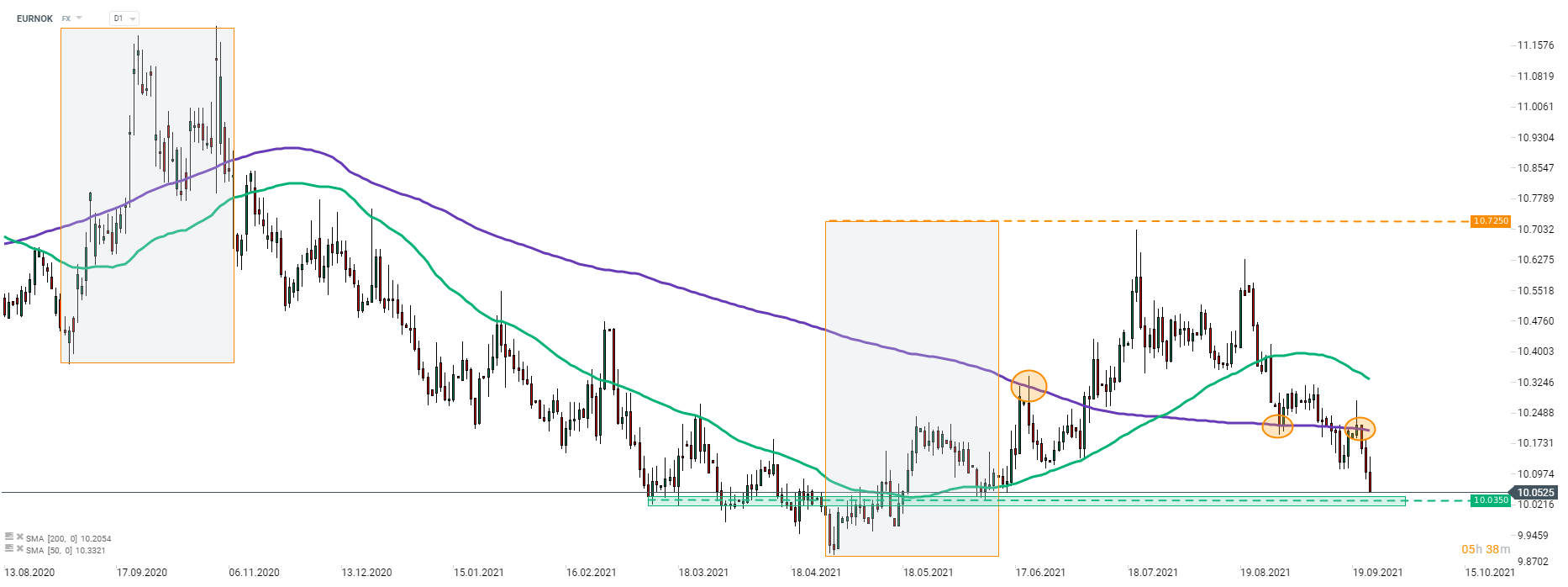 EURNOK bajó hoy después de que Norges Bank obtuviera una subida de tipos de 25 puntos básicos. El panorama técnico respalda un mayor fortalecimiento de la NOK frente al EUR: el par rompió por debajo del promedio móvil de 200 sesiones a principios de este mes y profundizó el declive después de un intento fallido de romper por encima de él esta semana. Una corrección al alza desde el segundo trimestre y principios del tercer trimestre no superó el rango de la corrección alcista anterior, lo que sugiere que la tendencia bajista todavía está en juego. Fuente: xStation5