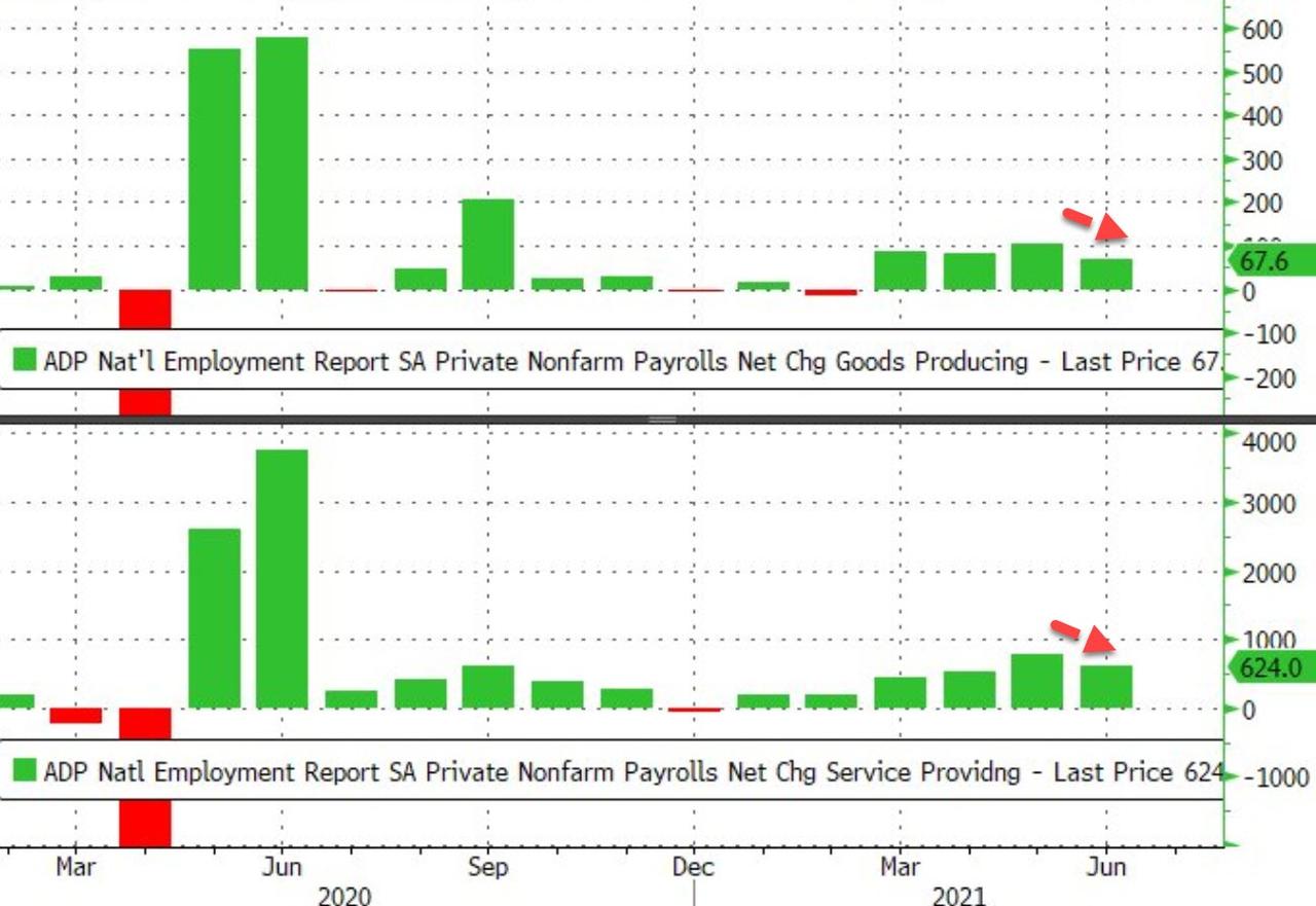 Ante los números de nóminas no agrícolas ampliamente monitorizados el viernes, el último informe de la compañía de nómina privada ADP muestra que se agregaron 692 mil empleos en junio, por debajo de los 886 mil revisados a la baja en mayo, pero mejor que las expectativas de los analistas de 600 mil .