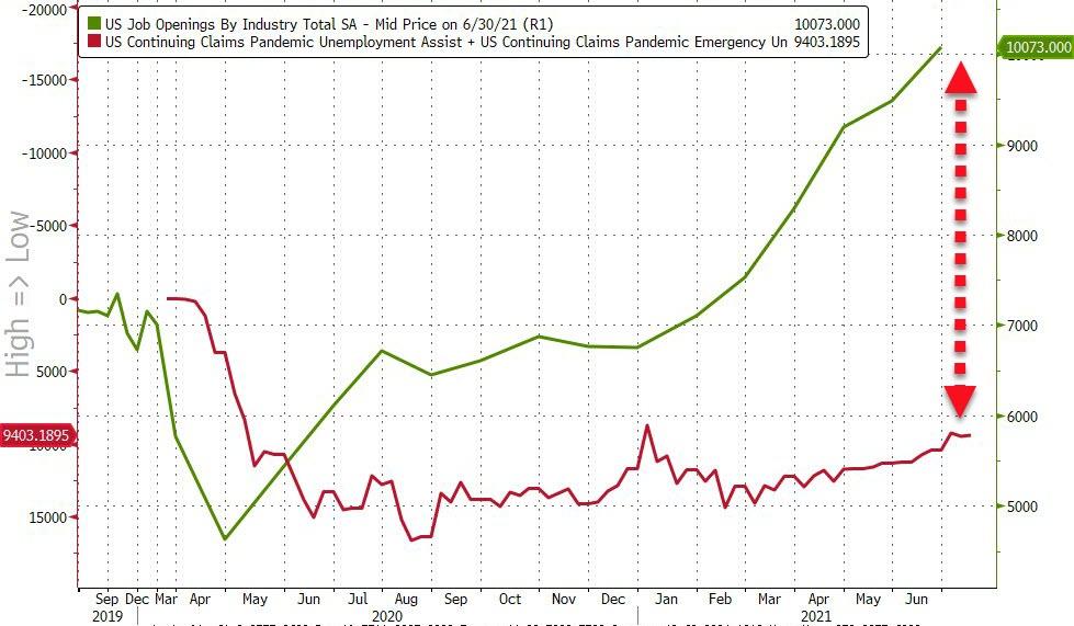 A pesar de la cantidad récord de puestos vacantes, todavía hay millones de estadounidenses que cobran reclamos por desempleo de emergencia pandémica. Fuente: Bloomberg a través de ZeroHedge