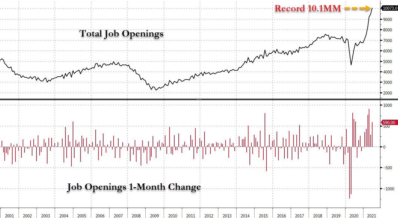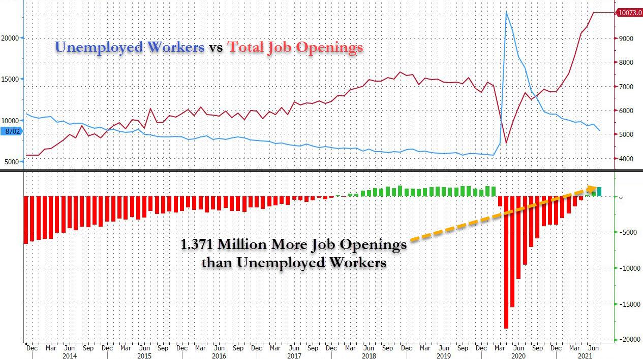 Las vacantes de empleo en EE. UU. aumentaron en los últimos 6 meses, y todos los meses de 2021 experimentaron un aumento. De hecho, esta es la racha más larga en la historia de la serie. Fuente: Bloomberg a través de ZeroHedge