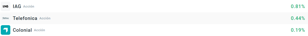 Las acciones de IAG suben un 0,8% y lideran al índice español. La aerolínea sigue subiendo y el mercado está a la espera de que anuncie un aumento en su remuneración en comparación con la del año pasado. Las acciones de Telefónica también suben, en lo que supone un suave rebote después de los descensos de ayer, que fueron importantes. Por último, las acciones de Colonial suben ligeramente.