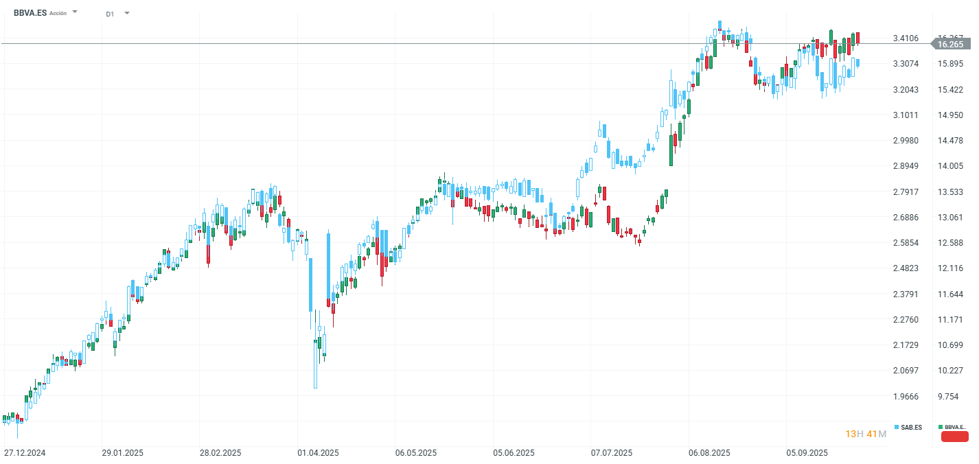 BBVA: velas verdes y rojas. Sabadell: velas azules y blancas.