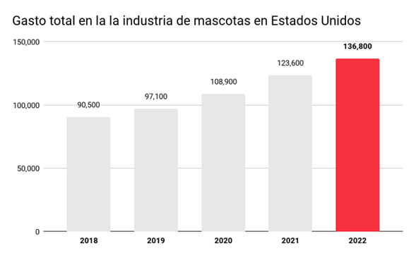 En Estados Unidos, el 66% de hogares tienen al menos una mascota mientras que en 1988 el 56% de ellos tenían. Sin embargo, no solo ha aumentado el número de mascotas sino que también lo ha hecho el gasto, con un crecimiento en el periodo 2018-2022 de casi un 11% anualizado.