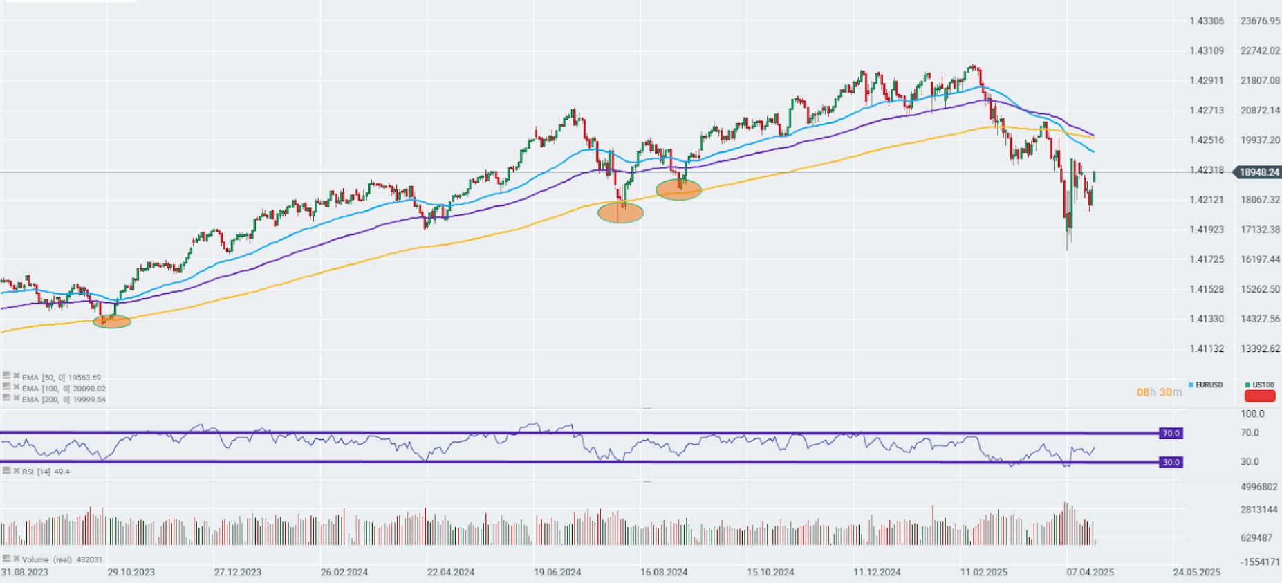 El índice Nasdaq 100 cotiza hoy un 3,2 % más alto que el cierre de ayer. El índice mantiene una tendencia bajista dinámica mientras la oferta se mantenga por debajo de la media móvil exponencial (EMA) de 200 días y los máximos locales del 10 de abril.