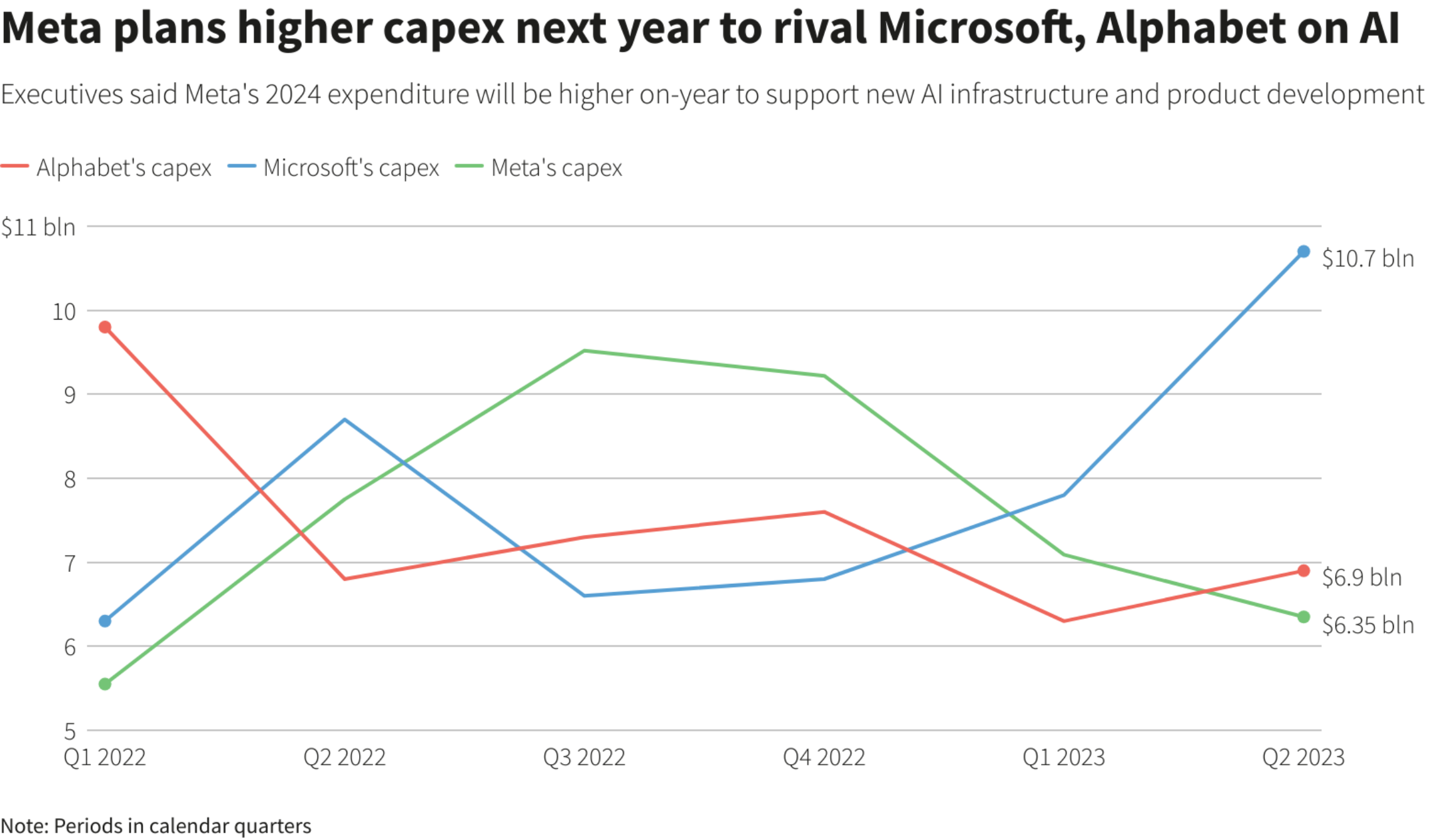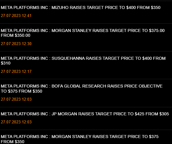 La empresa estima que los ingresos del tercer trimestre serán de 32.000-34.500 $ millones, por encima de las expectativas de los analistas de 31.100 $ millones. Estima inversiones inferiores a las previstas en 2023, a saber, 27.000-30.000 $ millones frente a 30.000-33.000 $ millones previstos. Se espera que los costes para todo el 2023 sean de 88.000-91.000 $ millones frente a los 86.000-90.000 $ millones anteriores debido a los costos legales en el segundo trimestre de 2023 (costes legales más altos en el segundo trimestre de 2023). La gerencia espera que las pérdidas operativas de la división que trabaja en el desarrollo de Reality Labs 'Metaverso' aumenten este año.