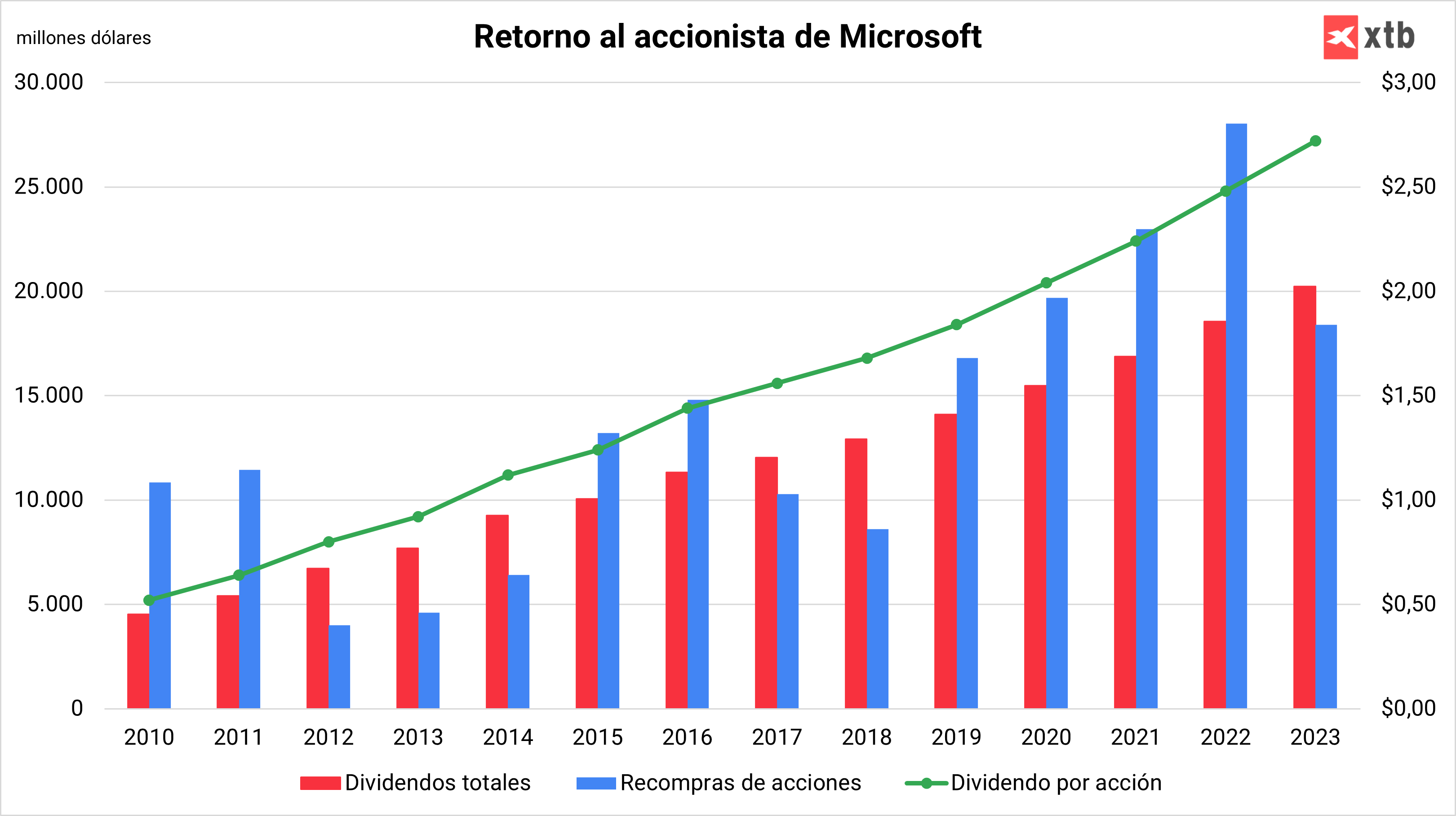 Microsoft llevará a cabo un nuevo plan de recompras de acciones de 60.000 millones de dólares sin fecha de expiración. De esta manera se iguala el anterior programa, que se lanzó en 2021. Para que nos hagamos una idea, las recompras de acciones han sido más relevantes en los últimos años que el reparto del dividendo, debido a que es una tendencia muy extendida en Estados Unidos. De esta manera, se reduce el número de acciones en circulación y por tanto aumenta el beneficio por acción.