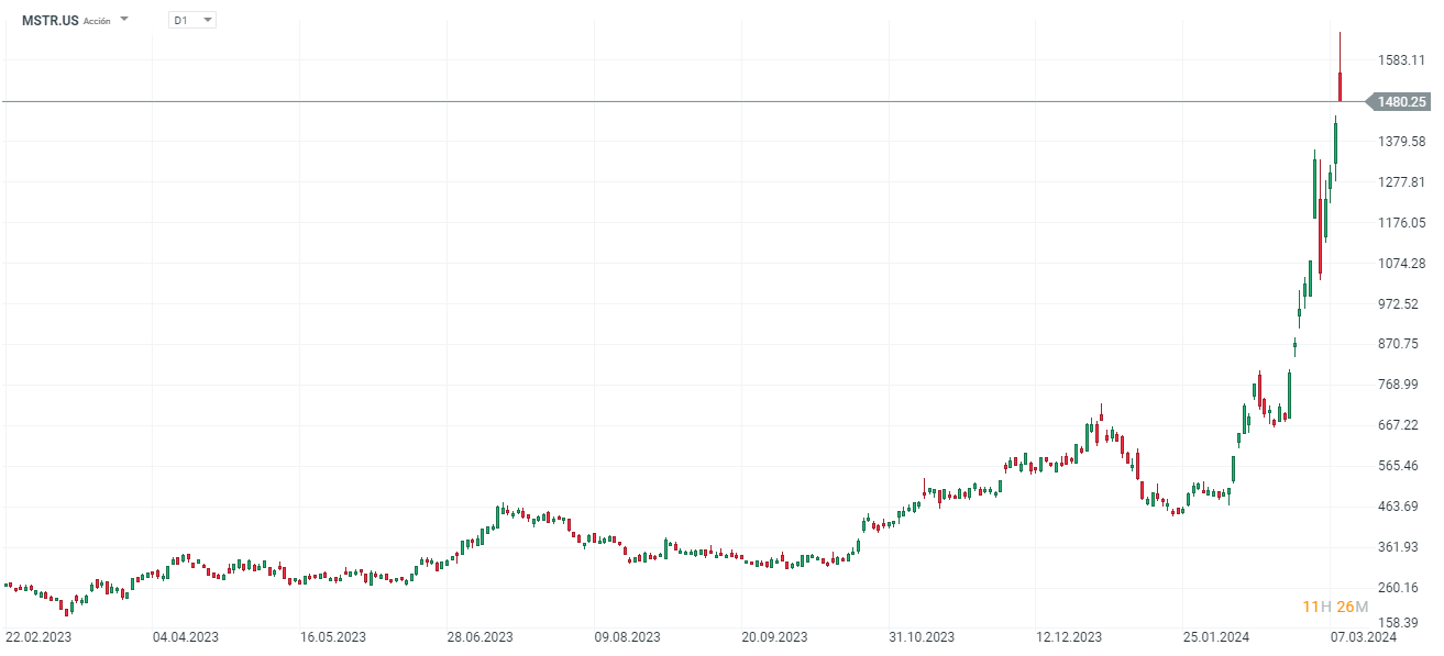 MicroStrategy ya ha gastado más de mil millones de dólares en Bitcoin en los primeros tres meses de 2024, más de la mitad de las compras totales del año pasado. La criptomoneda ha subido alrededor de un 675% desde que empezaron sus compras, y las acciones de Microstrategy han subido un 1000%. Mientras que en lo que llevamos de año acumula una subida de un 135%.