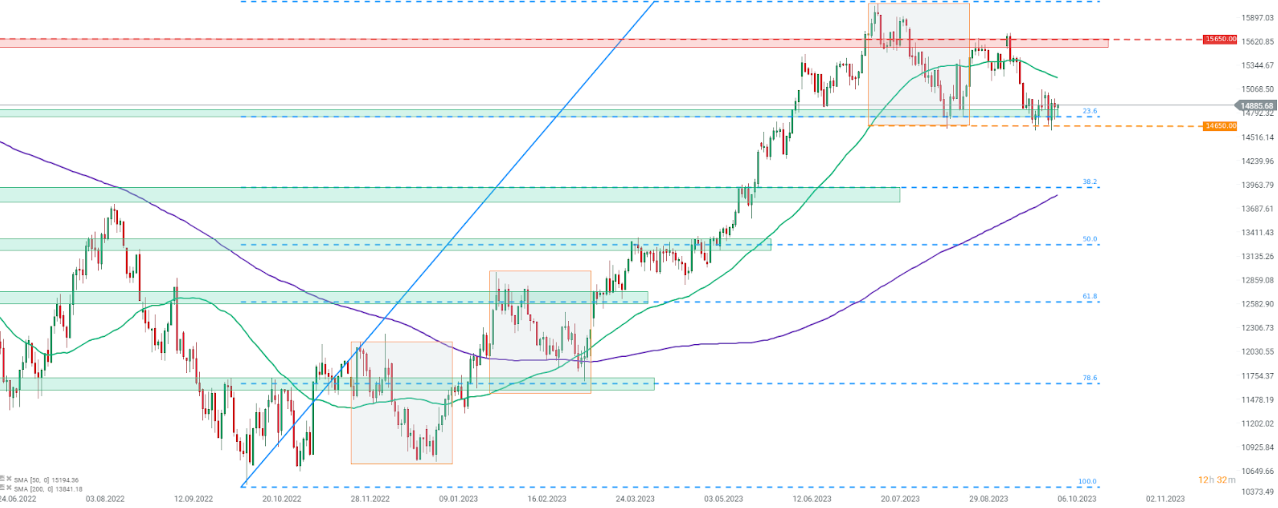 Los futuros del Nasdaq-100 han logrado recuperar la mayor parte de las pérdidas del comienzo de la semana, pero continúan cotizando por debajo de los 15.000 puntos. Una mirada al gráfico en el intervalo D1 muestra que el índice ha logrado defender el límite inferior de la estructura Overbalance en 14.650 pts y, por lo tanto, evitar que la configuración técnica se vuelva más bajista. Mientras el índice se mantenga por encima de la zona de los 14.650 pts la tendencia alcista seguirá en juego, al menos en teoría.