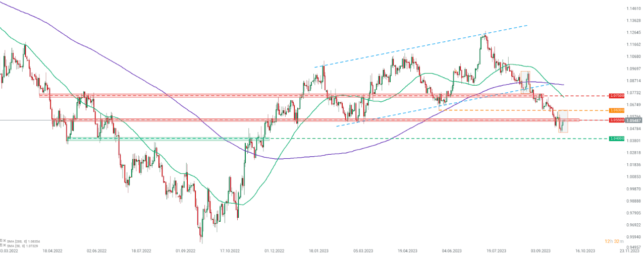 El fuerte repunte de los rendimientos de los bonos del Tesoro estadounidense ha brindado apoyo al dólar estadounidense y ha empujado al par EUR/USD a su nivel más bajo en 10 meses. A medida que la situación en el mercado de bonos se calmó un poco, se puede observar en el par un intento de recuperar algunas pérdidas y volver a subir por encima de la zona de resistencia de 1,0550 $. Sin embargo, incluso una ruptura por encima de esta zona no sería una confirmación de un cambio de tendencia alcista, ya que sería necesaria una ruptura por encima del límite superior de la estructura de sobrebalance en 1,0630 $.
