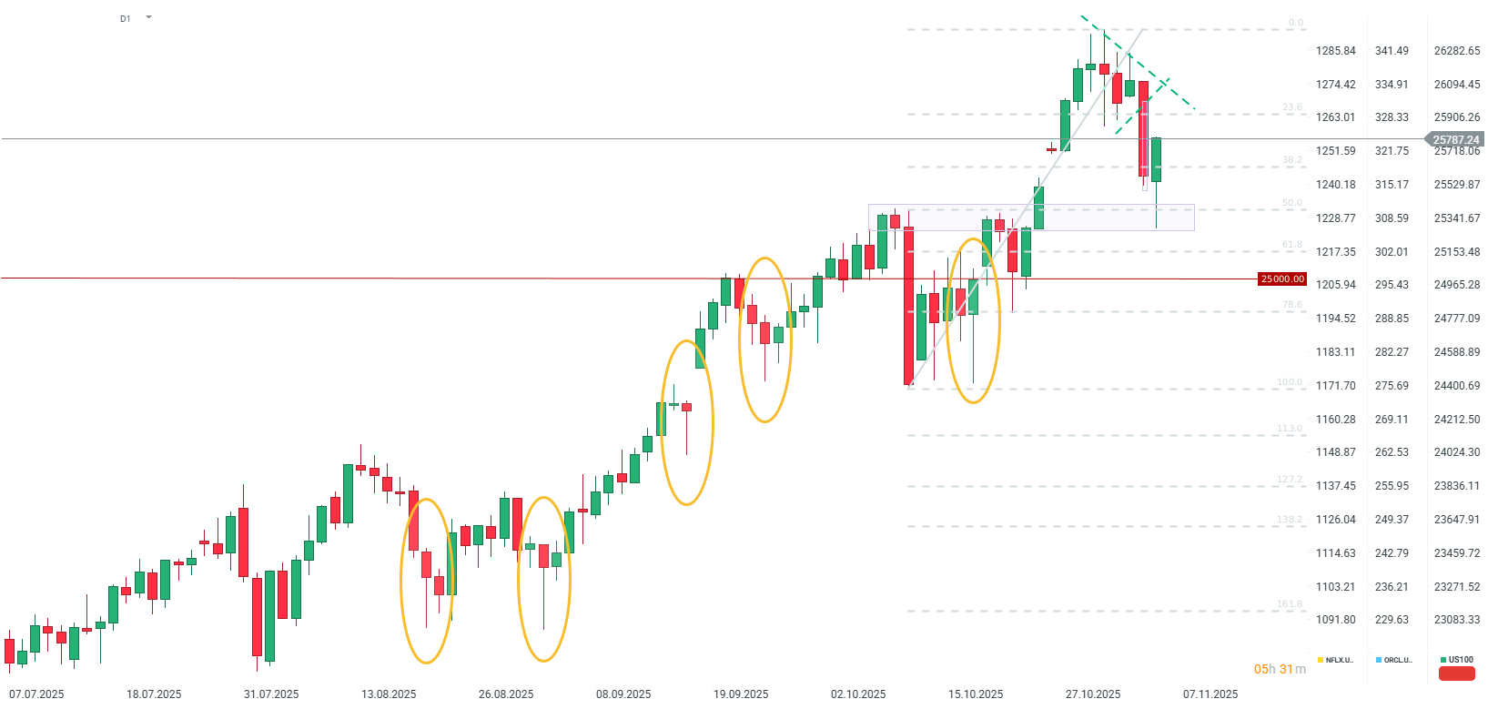 Si se confirma la estructura técnica actual —con una gran mecha inferior y cuerpo amplio en la vela diaria—, podría esperarse un rebote de mayor duración, con el próximo objetivo para los compradores en la zona de los 26.000 puntos.