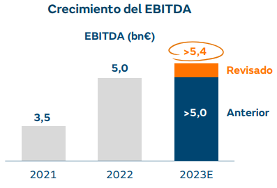 La compañía ha mejorado su previsión de beneficios para el año 2023, en concreto, ha aumentado su EBITDA esperado, de más de 5.000 millones de euros a más de 5.400 millones de euros, lo que supondría un crecimiento de en torno el 8% con respecto 2022. Además, la compañía reduciría así su apalancamiento hasta las 2,3 veces deuda neta frente al EBITDA.